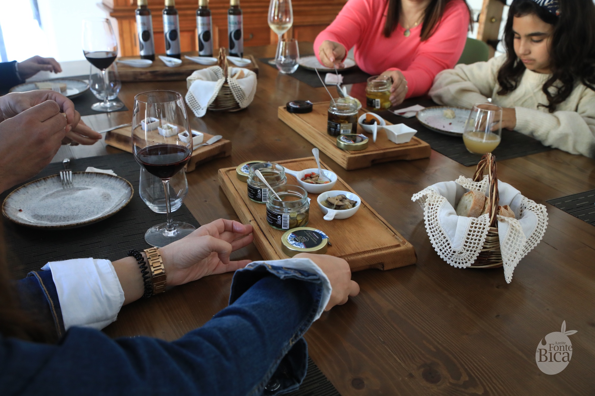 *Pão de Rio Maior, 3 types of olive spread, 2 recipes of shiitake mushrooms in olive oil, goat cheese in olive oil, 4 flavored olive oils, olive oil "butter", olives in olive oil with orange and thyme, olive oil dessert, with 2 local wine or natural juice.